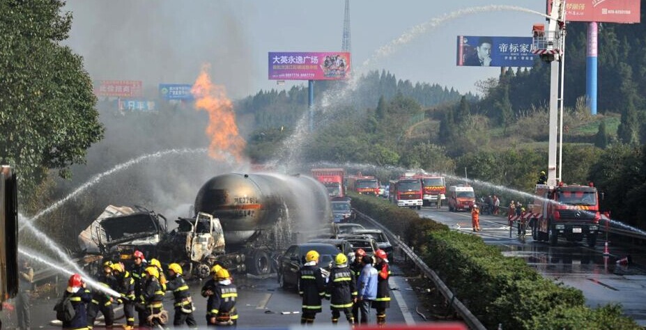 12月19日,沪蓉高速四川成南苍山段因大雾致连环追尾,一辆23吨级液化气槽车发生泄漏爆燃。